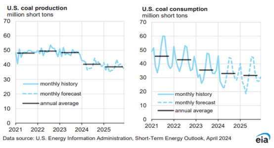 《短期能源展望》報(bào)告顯示,2024年,美國煤炭產(chǎn)量預(yù)計(jì)較2023年的5.816億短噸下降16.57%,至4.852億短噸。2025年產(chǎn)量繼續(xù)下降4.33%至4.642億短噸。