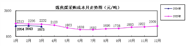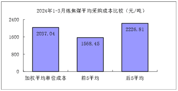 對標企業(yè)煉焦煤3月份加權平均折算成干基的采購成本為1973.49元/噸,環(huán)比下降89.73元/噸,降幅為4.35%。1-3月累計平均折算成干基的采購成本為2037.04元/噸,同比下降230.50元/噸,降幅為10.17%。