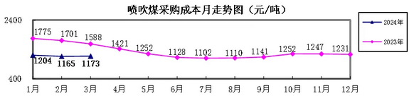 噴吹煤3月份加權平均折算成干基的采購成本為1172.85元/噸,環(huán)比升高7.58元/噸,升幅為0.65 %。1-3月累計平均折算成干基的采購成本為1180.09元/噸,同比下降509.48元/噸,降幅為30.15%。