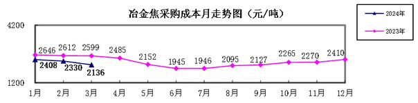 冶金焦3月份加權平均折算成干基的采購成本2136.22元/噸,環(huán)比下降194.13元/噸,降幅為8.33%。1-3月累計平均折算成干基的采購成本為2298.25元/噸,同比下降320.86元/噸,降幅為12.25%。