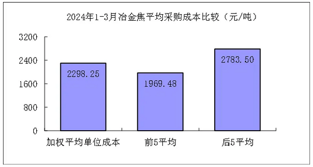 1-3月對標企業(yè)冶金焦平均采購成本最低的前5家企業(yè)的加權平均采購成本為1969.48元/噸,比對標企業(yè)平均采購成本低328.77元/噸,低于平均采購成本14.31%;而采購成本最高的5家企業(yè)的加權平均采購成本為2783.50元/噸,比對標企業(yè)平均采購成本高485.26元/噸,高于平均采購成本21.11%。