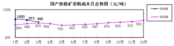 國產鐵精礦(干基)3月份加權平均采購成本為894.53元/噸,環(huán)比下降78.12元/噸,降幅為8.03%。1-3月累計平均采購成本為961.24元/噸,同比升高116.27元/噸,升幅為13.76%。