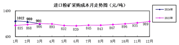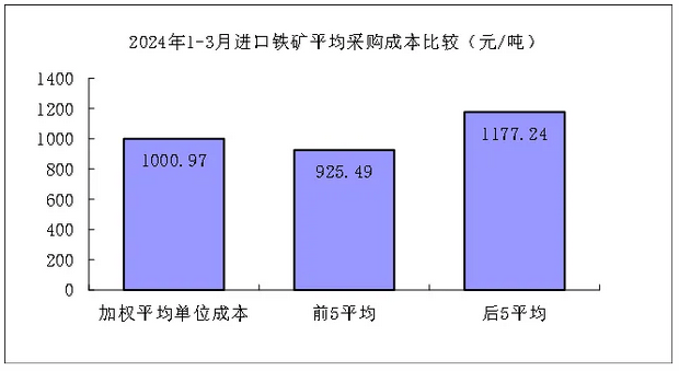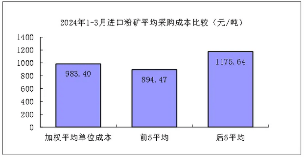 進口粉礦3月份加權平均采購成本900.70元/噸,環(huán)比下降79.34元/噸,降幅為8.10%。1-3月累計平均采購成本為961.79元/噸,同比升高91.99元/噸,升幅為10.58%。