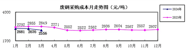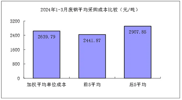 廢鋼3月份加權平均采購成本為2555.67元/噸,環(huán)比下降120.47元/噸,降幅為4.50%。1-3月累計平均采購成本為2639.79元/噸,同比下降178.80元/噸,降幅為6.34%。