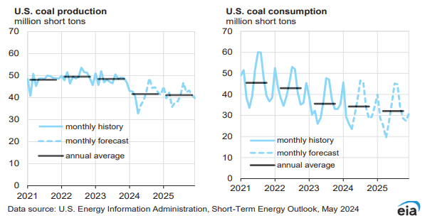 產(chǎn)量方面,《短期能源展望》報(bào)告預(yù)計(jì),2024年,美國(guó)煤炭產(chǎn)量接近5億短噸,高于前一月預(yù)期值4.852億短噸,但較2023年的5.816億短噸下降14.1%。2025年,美國(guó)煤炭產(chǎn)量預(yù)計(jì)為4.936億短噸,同比下降1.16%。