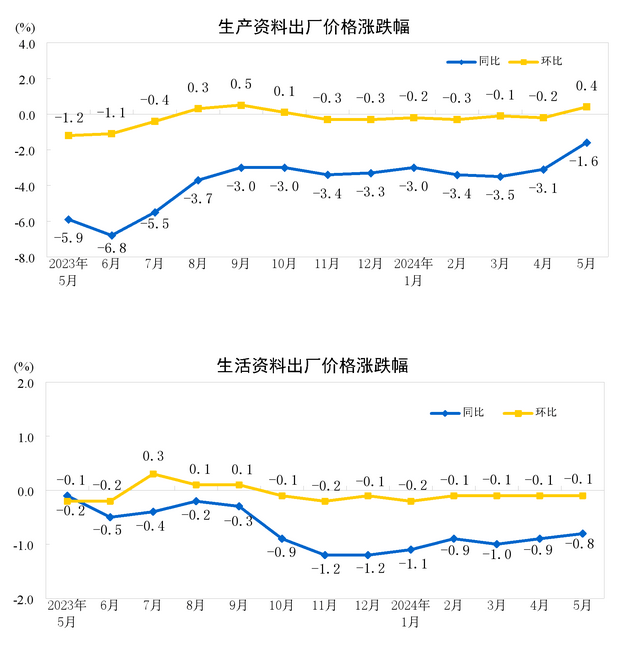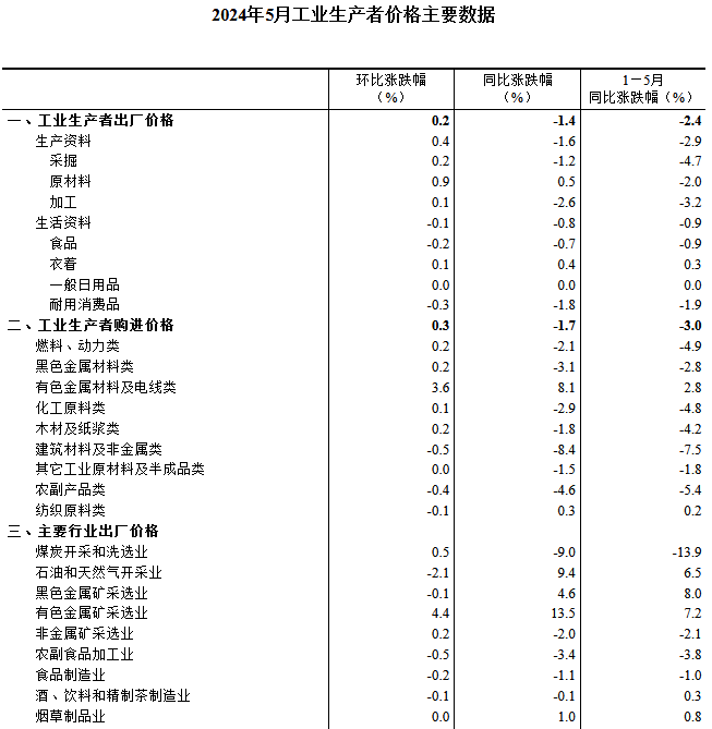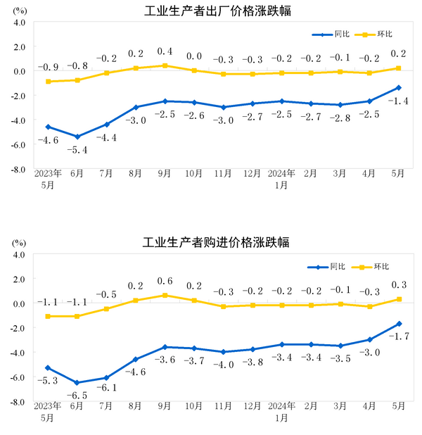 2024年5月份,全國工業(yè)生產(chǎn)者出廠價格同比下降1.4%,降幅比上月收窄1.1個百分點,環(huán)比上漲0.2%,上月為下降0.2%;工業(yè)生產(chǎn)者購進價格同比下降1.7%,環(huán)比上漲0.3%。1—5月平均,工業(yè)生產(chǎn)者出廠價格比上年同期下降2.4%,工業(yè)生產(chǎn)者購進價格下降3.0%。