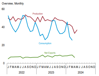消費(fèi)方面,報(bào)告顯示,2024年3月份,美國(guó)煤炭總消費(fèi)量為2562.2萬(wàn)短噸,同比下降20.56%,環(huán)比下降12.5%。