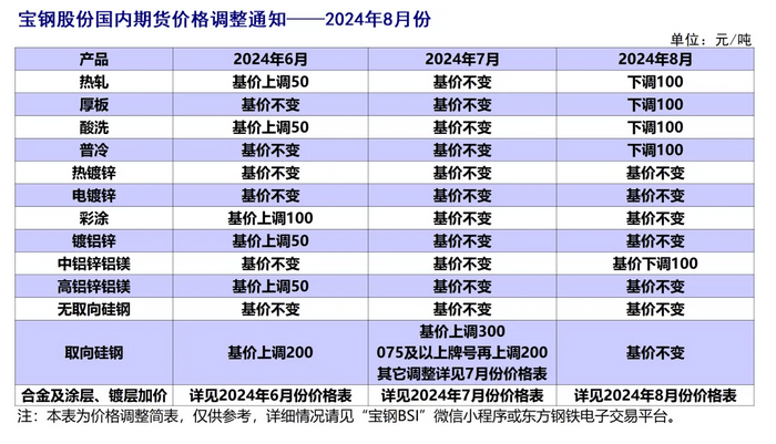 經(jīng)研究決定,寶鋼股份板材內(nèi)銷(xiāo)價(jià)格2024年8月份在2024年7月份基礎(chǔ)上調(diào)整公告如下(以下除特殊注明外,均為不含稅):
