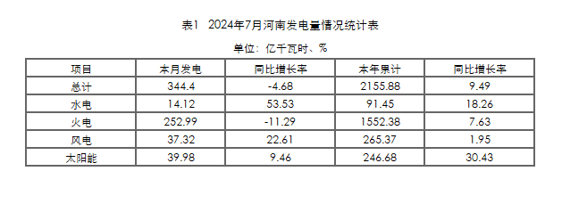 據(jù)河南能監(jiān)辦公布數(shù)據(jù),2024年7月,全省全社會用電量415.57億千瓦時,同比減少2.57%;年累計用電量2502.94億千瓦時,同比增加7.21%。全省發(fā)電量344.40億千瓦時,同比減少4.68%;年累計發(fā)電量2155.88億千瓦時,同比增加9.49%。