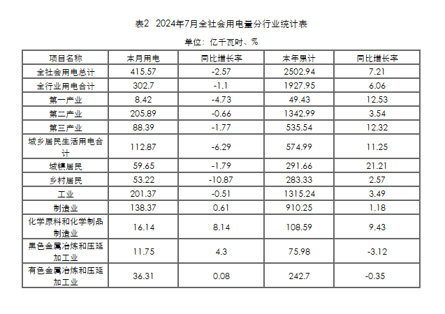 (一)全社會用電量情況。7月份當(dāng)月,全省全社會用電量415.57億千瓦時,同比減少2.57%。