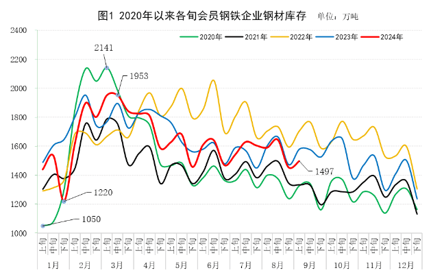 2024年9月上旬,重點(diǎn)統(tǒng)計(jì)鋼鐵企業(yè)(以下簡稱“重點(diǎn)企業(yè)”)鋼材庫存量1497萬噸,環(huán)比上一旬增加43萬噸,增長2.9%;比年初增加261萬噸,上升21.1%;比上月同旬減少93萬噸,下降5.8%;比去年同旬減少83萬噸,下降5.3%,比前年同旬減少209萬噸,下降12.3%(見圖1)。