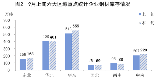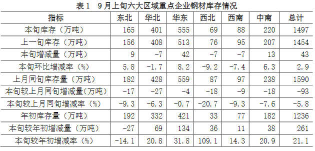 9月上旬,西北、西南、華北地區(qū)重點(diǎn)企業(yè)鋼材庫存較上一旬出現(xiàn)不同程度下降,其他地區(qū)有所增加,具體情況為: