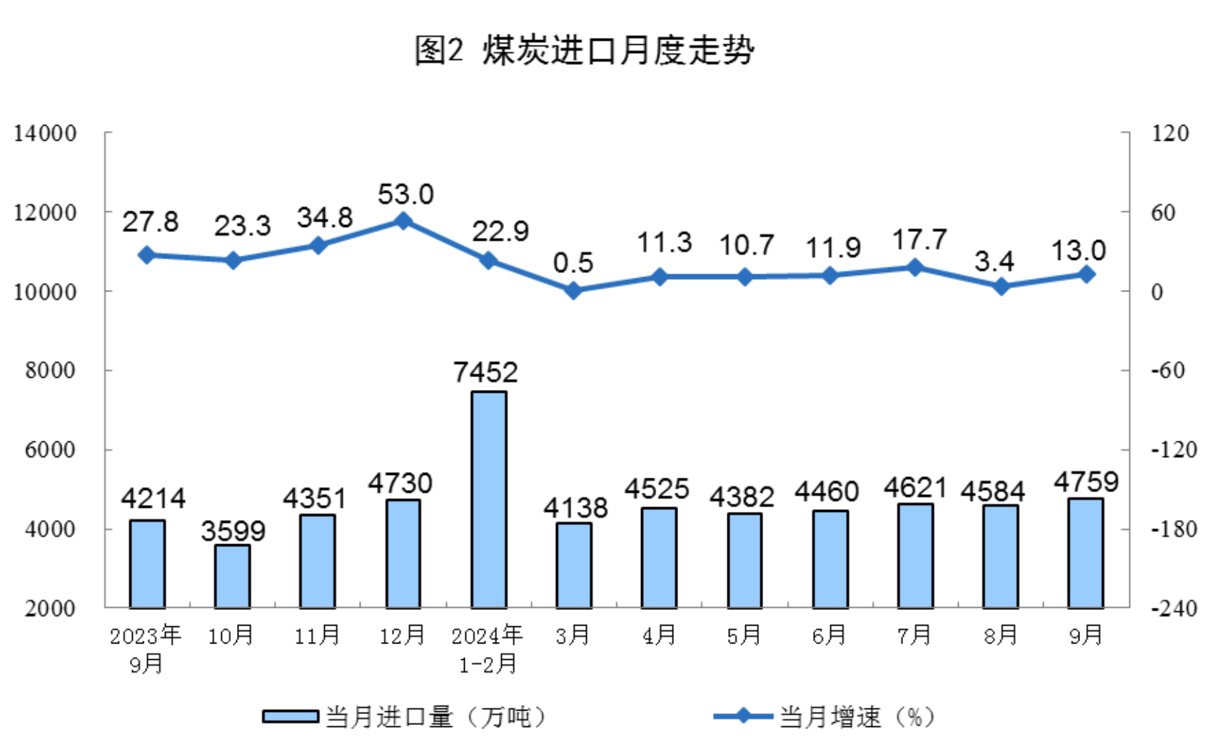 原煤生產增速加快。9月份,規(guī)上工業(yè)原煤產量4.1億噸,同比增長4.4%,增速比8月份加快1.6個百分點;日均產量1381.5萬噸。進口煤炭4759萬噸,同比增長13.0%。