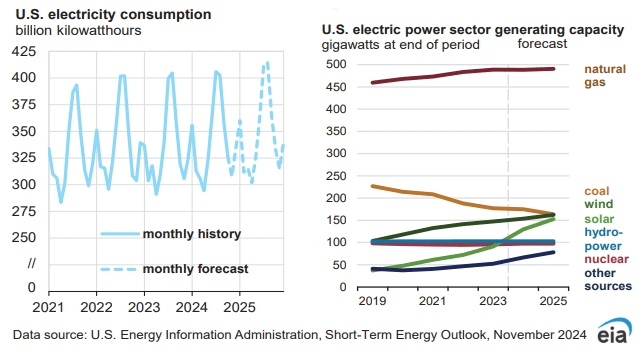 美國(guó)能源信息署(EIA)11月13日發(fā)布的最新《短期能源展望》報(bào)告顯示,2024和2025年,美國(guó)電力消費(fèi)量預(yù)計(jì)將創(chuàng)歷史紀(jì)錄新高。