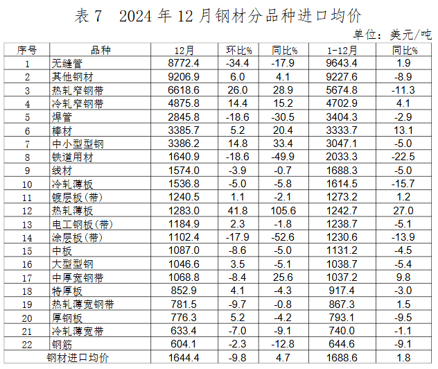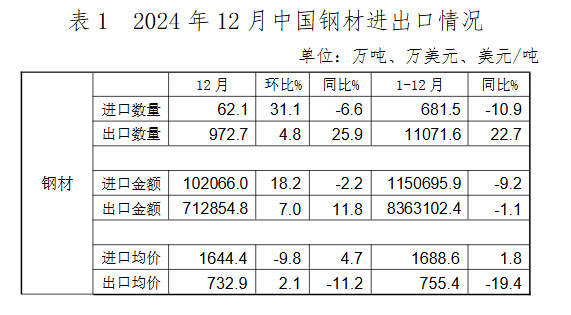 2024年12月,我國出口鋼材972.7萬噸,環(huán)比增長4.8%,出口均價732.9美元/噸,環(huán)比小幅回升2.1%。1-12月,我國累計出口鋼材11071.6萬噸,同比增長22.7%,出口均價755.4美元/噸,同比下降19.4%。12月,我國進口鋼材62.1萬噸,環(huán)比增長31.1%,進口均價1644.4美元/噸,環(huán)比下降9.8%。1-12月,我國累計進口鋼材681.5萬噸,同比下降10.9%,進口均價1688.6美元/噸,同比增長1.8%。