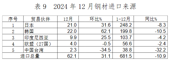 鋼材進口來源持續(xù)穩(wěn)定,12月自日本、韓國和印度尼西亞進口鋼材數(shù)量環(huán)比增幅較大,自中國臺灣進口持續(xù)下降。日本、韓國和印度尼西亞是我鋼材進口的主要來源,2024年自上述三國進口占我國鋼材進口總量的81.0%。